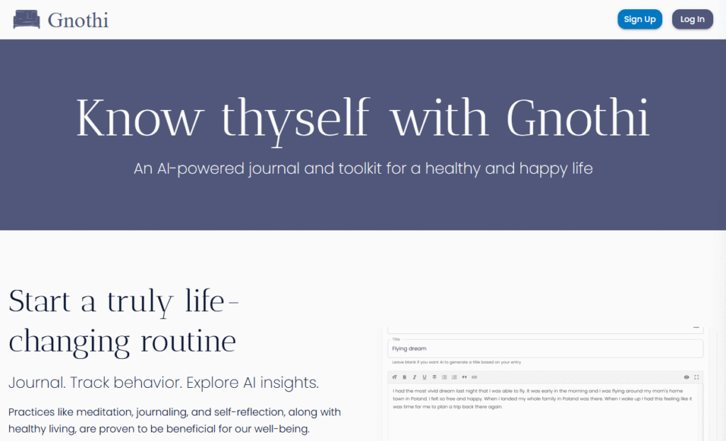 Gnothi(又稱 Gnothi.ai)是一款開源的 AI 日誌與自我探索工具。其名稱取自古希臘語「Know thyself(認識你自己)」。它結合日記、習慣追蹤、夢境分析、行為模式識別與 AI 驅動的見解功能,幫助用戶從日常記錄中看見潛在的主題、情緒走向與成長線索。它也會推薦書籍資源、幫你總結過去的日記、幫助你發現重複出現的主題。雖然它具有自我探索與心理輔助色彩,但它在條款中也明確指出並非專業醫療或心理診斷工具。